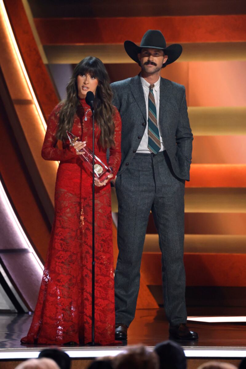The 59th Annual CMA Awards - Show NASHVILLE, TENNESSEE - NOVEMBER 19: EDITORIAL USE ONLY (L-R) Ella Langley and Riley Green accept the Song of the Year Award for “you look like you love me” onstage during the 59th Annual CMA Awards at Bridgestone Arena on November 19, 2025 in Nashville, Tennessee. (Photo by Jason Kempin/Getty Images) (Jason Kempin/Getty Images)