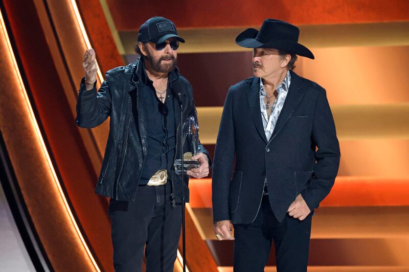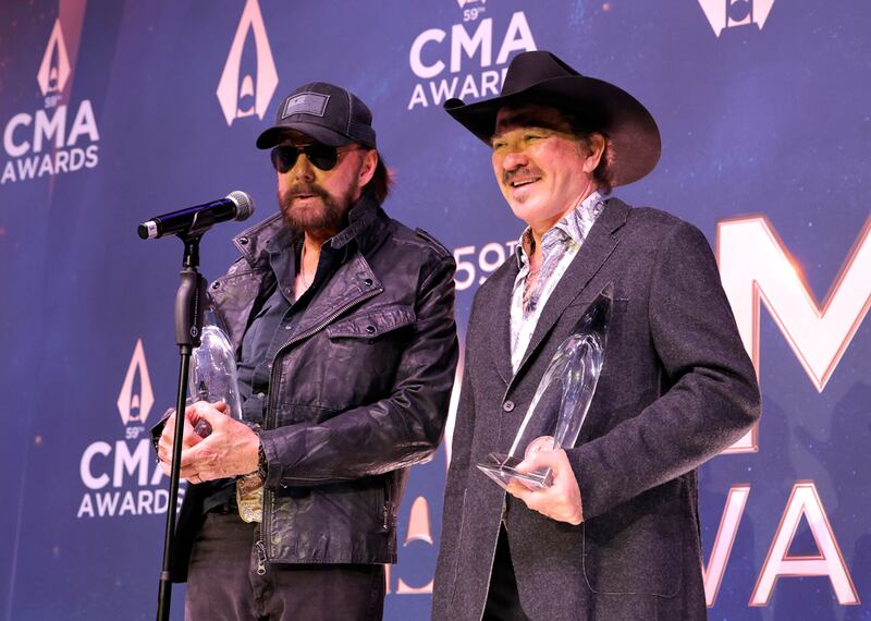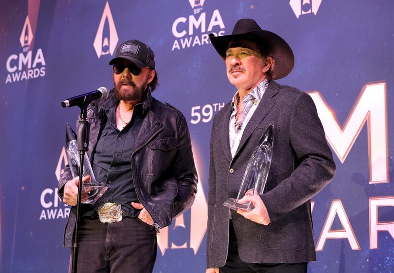 The 59th Annual CMA Awards - Show NASHVILLE, TENNESSEE - NOVEMBER 19: EDITORIAL USE ONLY (L-R) Ronnie Dunn and Kix Brooks of Brooks & Dunn accept the Vocal Duo of the Year Award onstage during the 59th Annual CMA Awards at Bridgestone Arena on November 19, 2025 in Nashville, Tennessee. (Photo by Jason Kempin/Getty Images) (Jason Kempin/Getty Images)