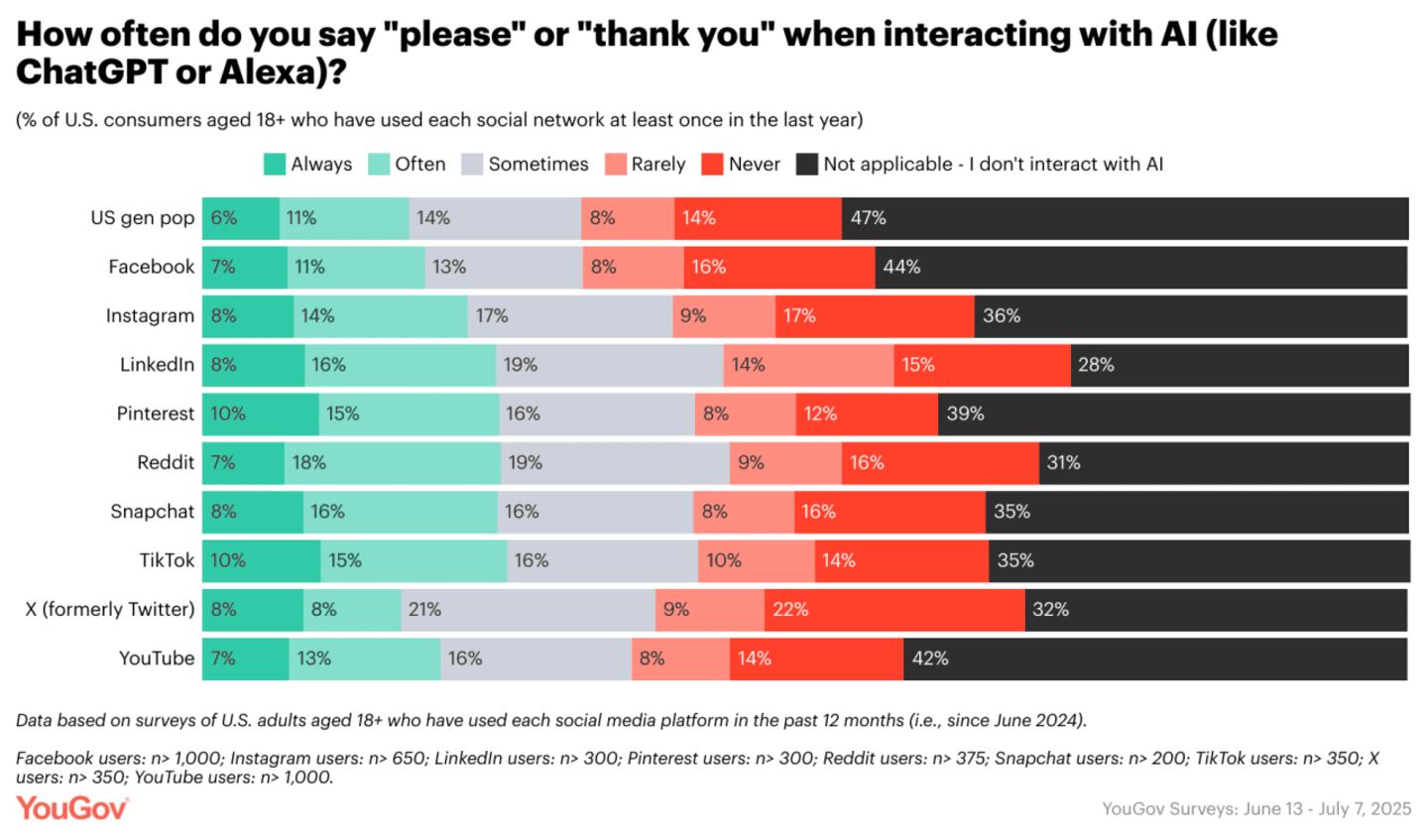 YouGov previously touched on the trend of AI politeness on its "Reality checks" talkshow in May 2025, where expert guest Brian Synder, Chief Innovation Officer at Axicom, explored AI-fueled shifts in consumer behavior across the path to purchase.