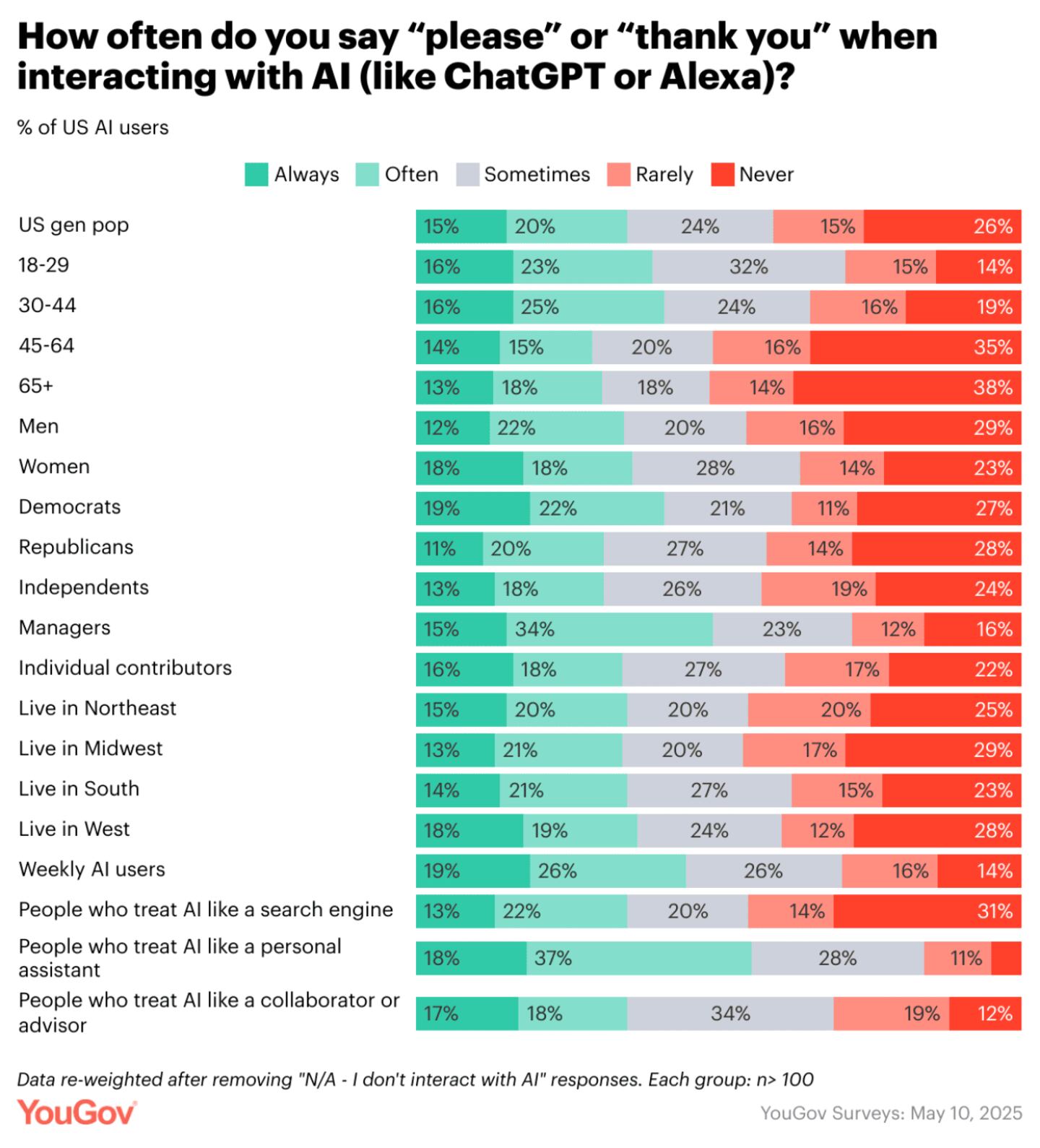 Research conducted as part of the project found that Americans who have management responsibilities at their jobs (49%) have the highest proportion of any group profiled to use courteous words, while Americans aged 45-65 (19%) are the least likely to say "please" and "thank you" when interacting with AI.