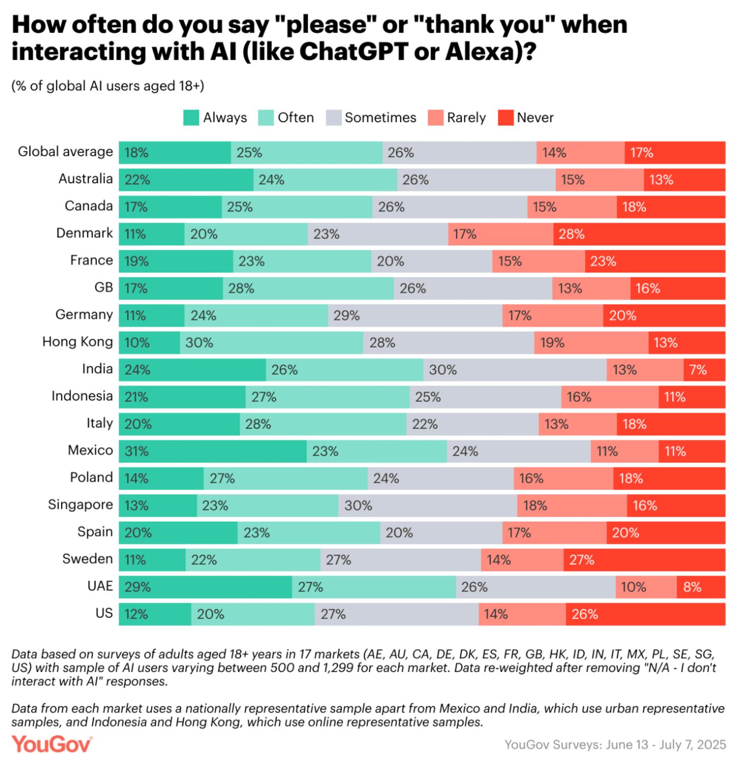 Results show that while 18% of global AI users always use these polite expressions, a nearly equal 17% never do so.