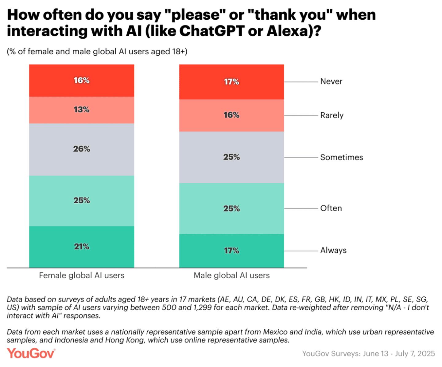 YouGov’s global research delves into variations across the 17 countries studied, gender differences, and examines how men and women in each nation approach AI courtesy, culminating in a snapshot of AI attitudes in the United States.