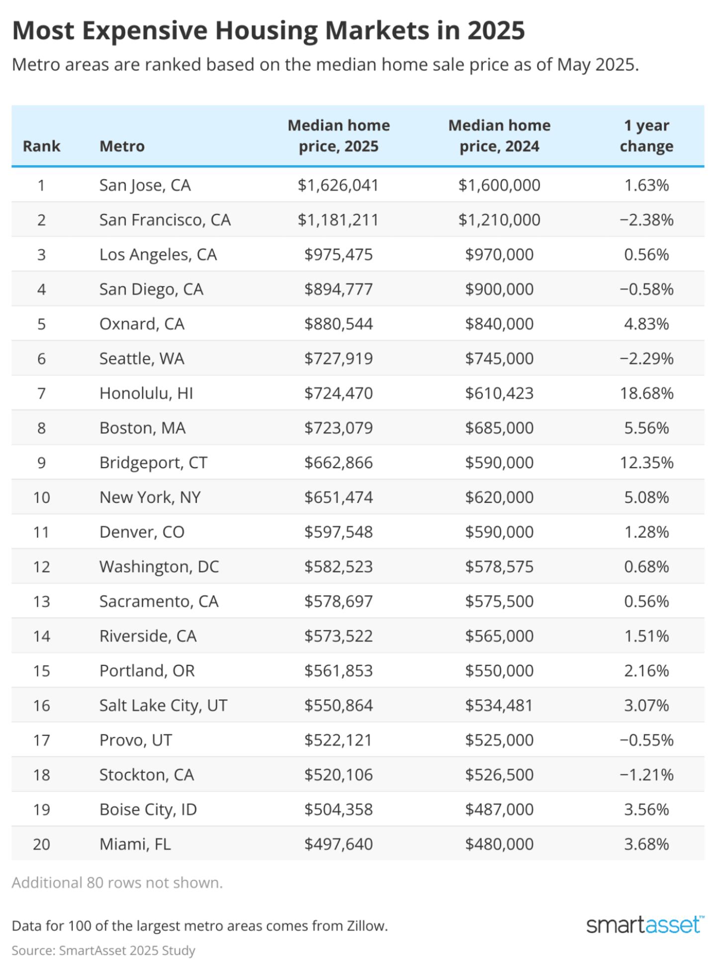 This SmartAsset study examined median sale prices for 100 of the largest metro areas in the U.S. with available data to determine the most and least expensive housing markets. Data for May 2025, 2024, and 2020 comes from Zillow for single-family homes, condos, and co-ops.
