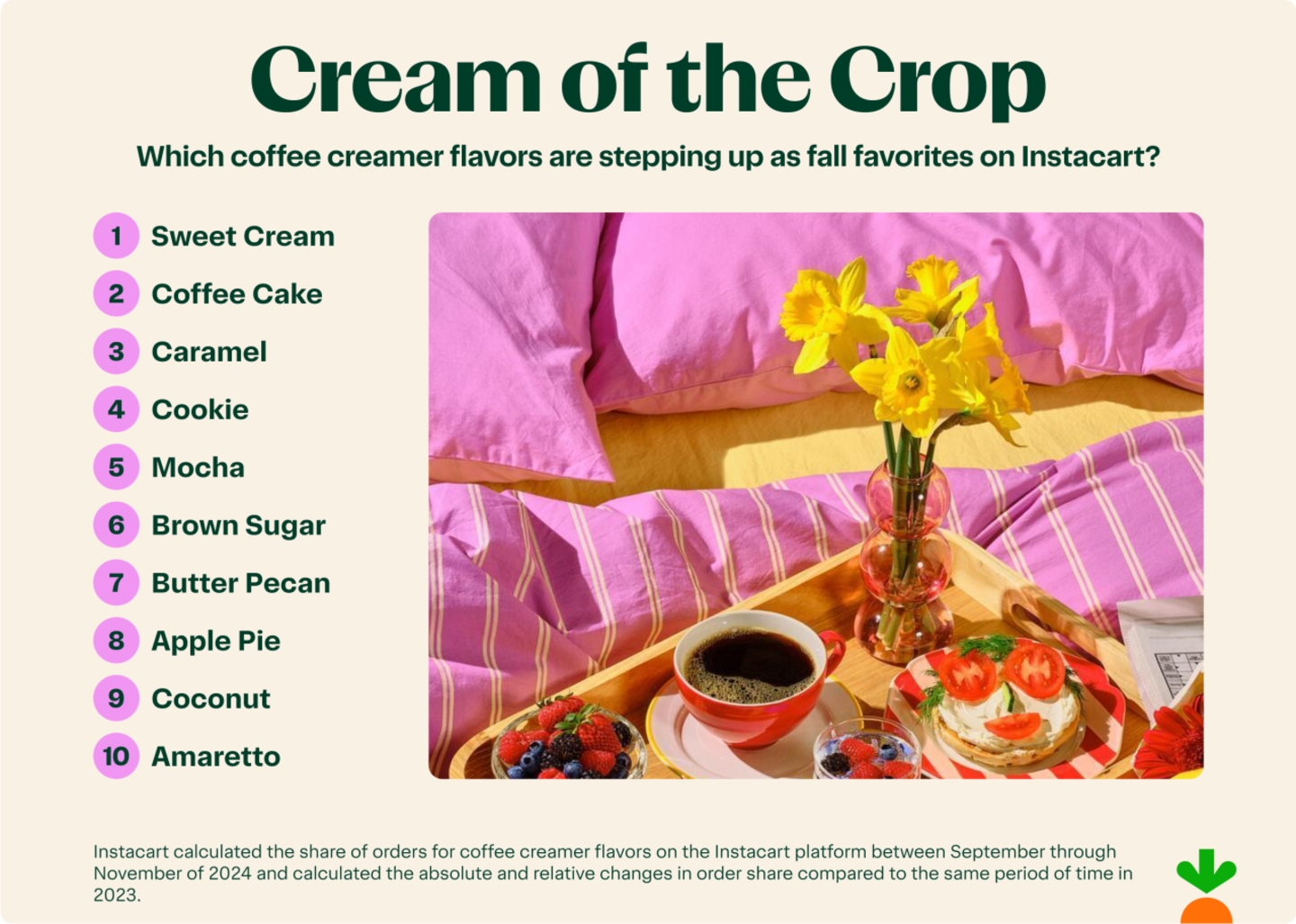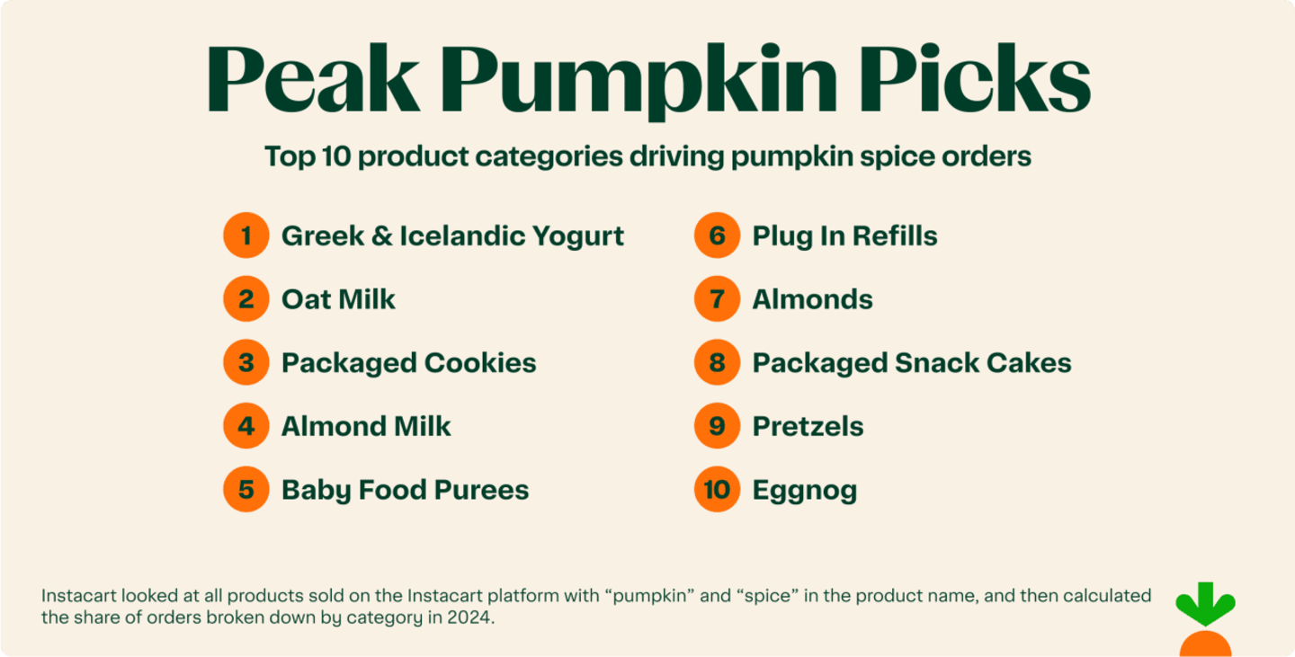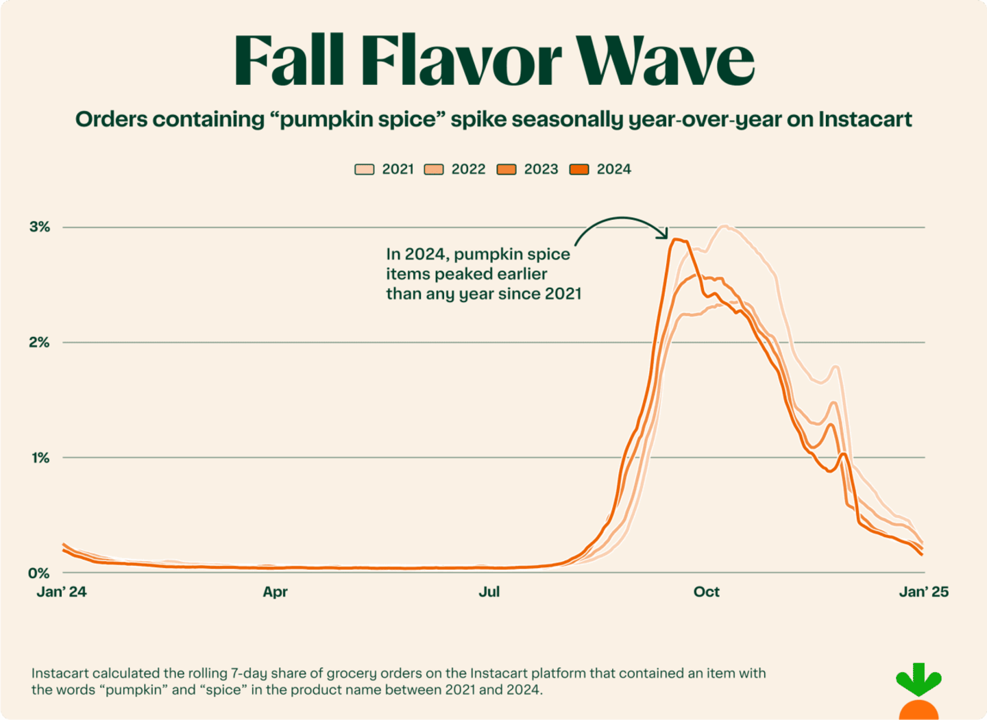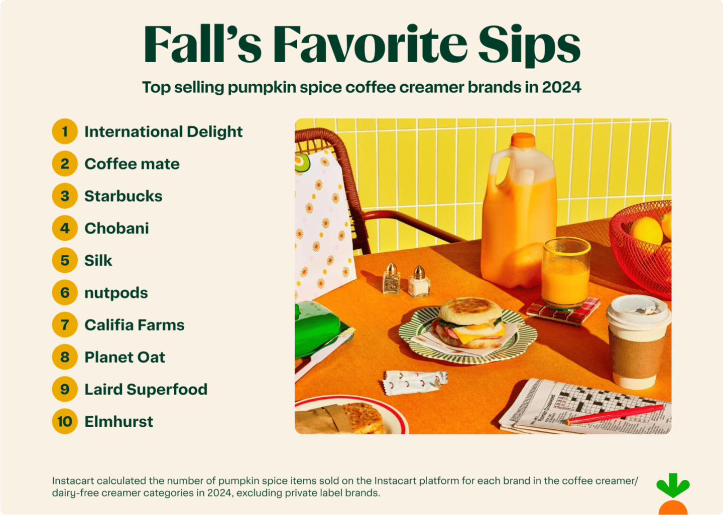 *Methodology: Instacart calculated the share of grocery orders on the Instacart platform that contained Pumpkin Spice flavored coffee creamer in September-November 2024 and calculated the percentage difference from the rest of 2024.
