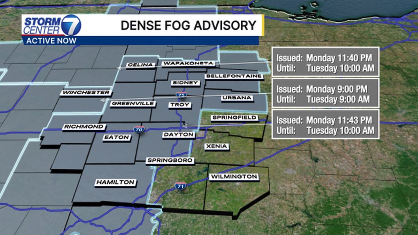 Auglaize, Butler, Champaign, Darke, Logan, Mercer, Miami, Montgomery, Preble, Shelby and Wayne (IN) counties are under a Dense Fog Advisory until 10 a.m. Tuesday.