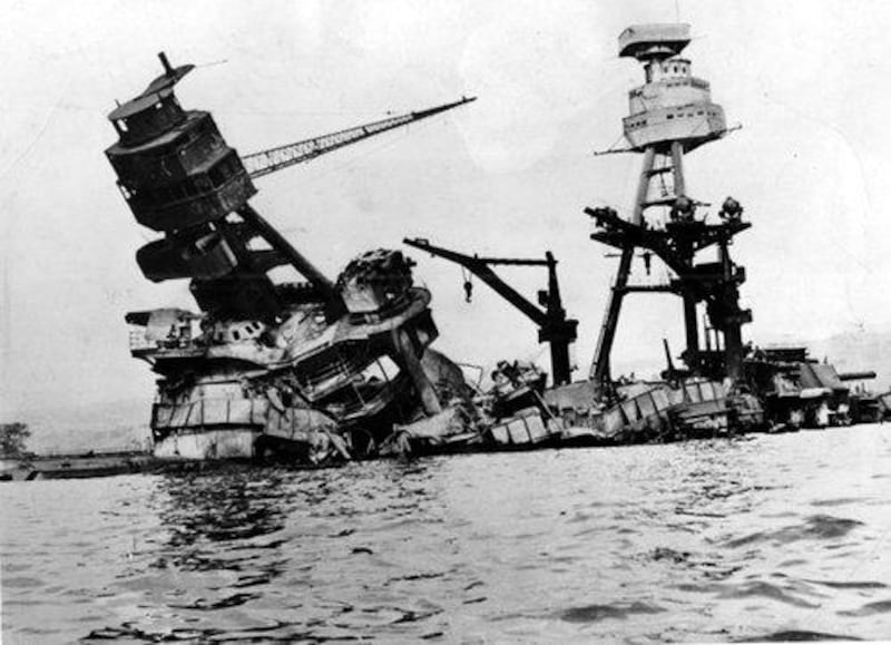 The above photo released by the U.S. Navy for publication in the morning papers of February 3rd,1942, shows the battered hulk of the USS Arizona lying in the mud of Pearl Harbor, Hawaii. (U. S. Navy/ACME)