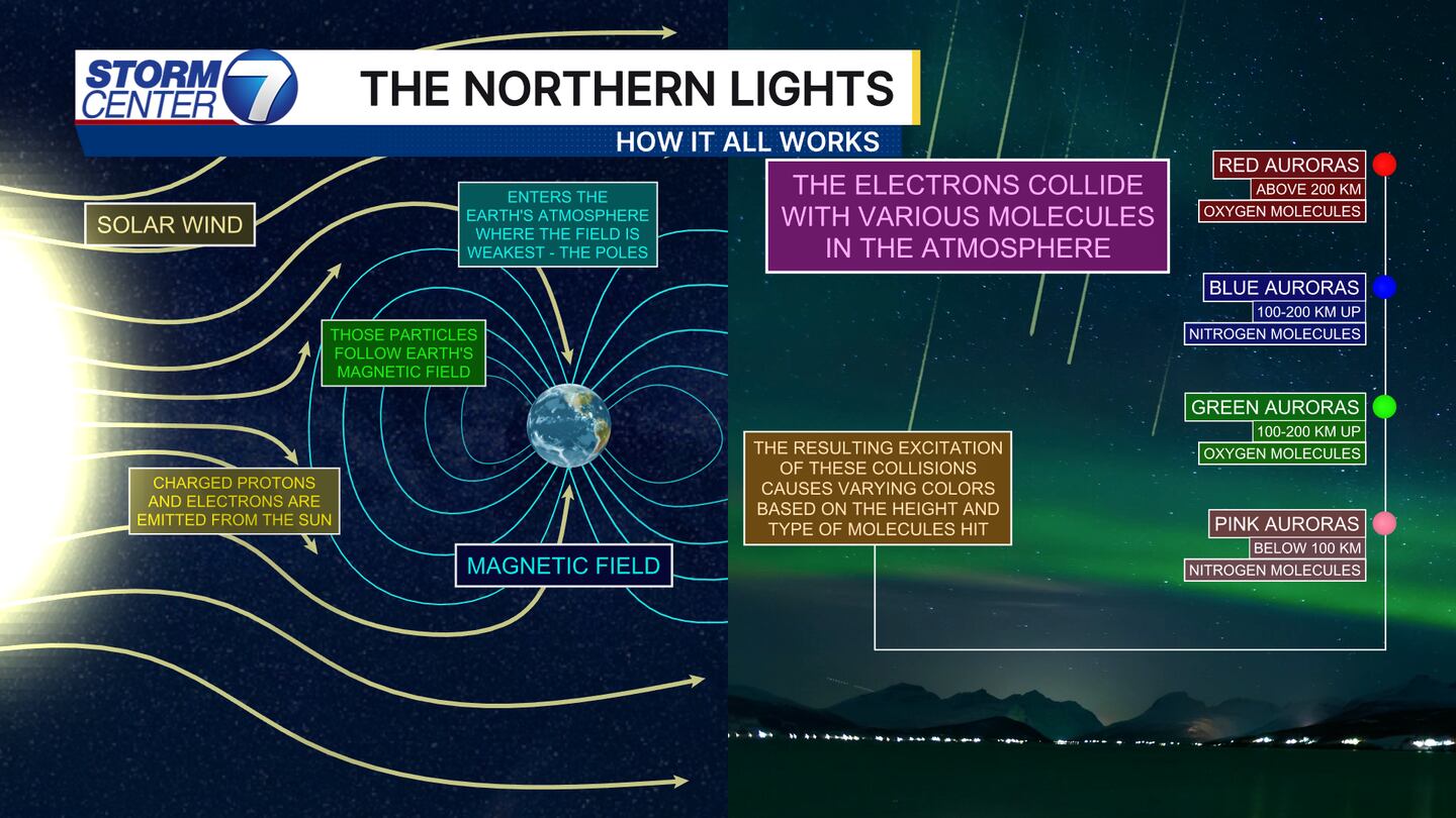 As a refresher, as solar storms move towards Earth, they can enter our atmosphere at the poles of Earth where the magnetic field is weakest. From there, as the charged particles interact with oxygen and nitrogen molecules in the atmosphere, the end result are the pretty colors some of you recall from last year in particular.