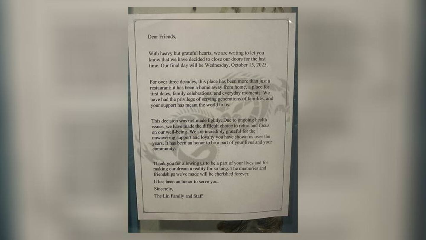 “Our final day will be Wednesday, October 15, 2025,” the Lin Family said in a note on its door.