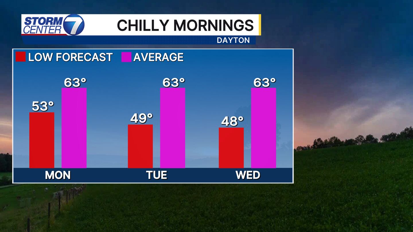 Monday morning starts the chill with low temperatures in the low 50s, while our average overnight low is in the mid-60s.