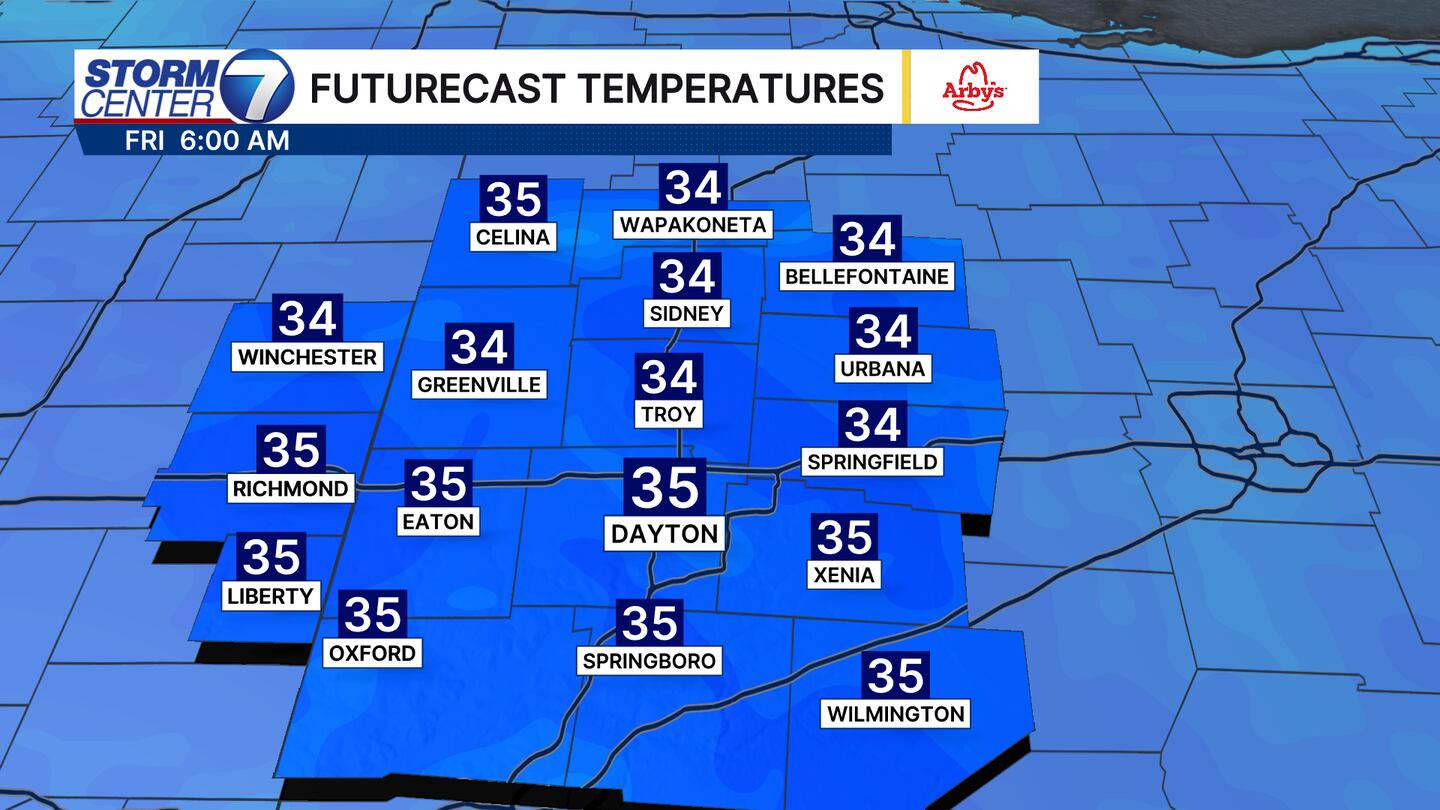 By Friday morning, widespread frost is expected with temperatures dropping into the mid-30s.