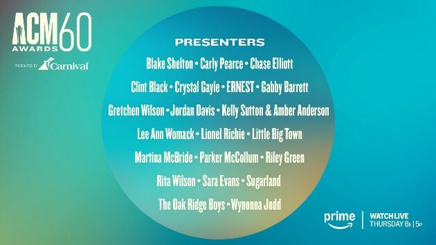 Country artists set to present include Blake Shelton, Carly Pearce, Clint Black, Crystal Gayle, ERNEST, Gabby Barrett, Gretchen Wilson, Jordan Davis, Lee Ann Womack, Little Big Town, Martina McBride, Parker McCollum, Riley Green, Sara Evans, Sugarland, The Oak Ridge Boys and Wynonna Judd.