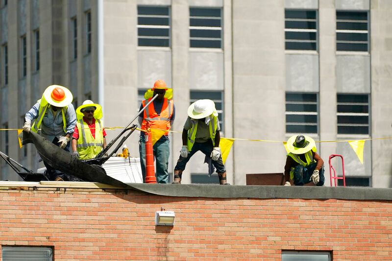 U.S. Heat Wave Workmen brave the oppressive heat in Jackson, Miss., as they reroof the Barfield Complex, Monday, June 13, 2022. Heat advisories, excessive heat warnings and excessive heat watches were issued over states stretching through parts of the Gulf Coast to the Great Lakes and east to the Carolinas. (AP Photo/Rogelio V. Solis) (Rogelio V. Solis/AP)