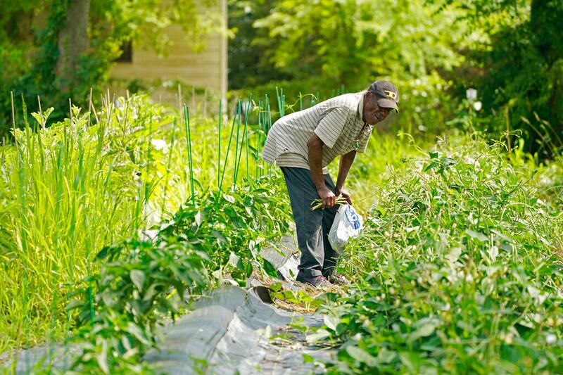 U.S. Heat Wave Roger Britt looks through a row of snap peas as he choses an assortment of vegetables for his dinner from a community garden in downtown Jackson, Miss., Monday, June 13, 2022. Britt braved the oppressive heat for an hour for a sackful of green beans, tomatoes, snap peas and okra. (AP Photo/Rogelio V. Solis) (Rogelio V. Solis/AP)