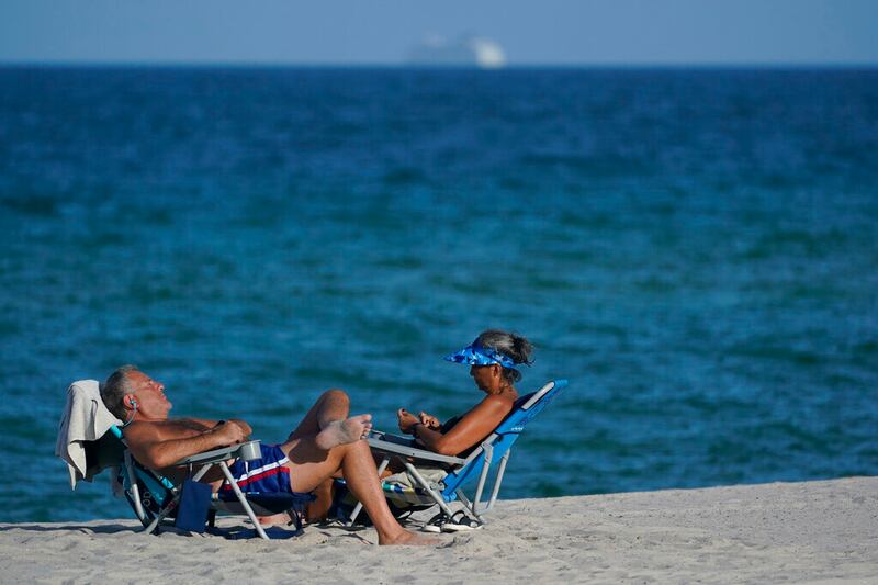 U.S. Heat Wave A pair of beachgoers sunbathe, Monday, June 13, 2022, in Surfside, Fla. More than 100 million Americans are being warned to stay indoors if possible as high temperatures and humidity settle in over states stretching through parts of the Gulf Coast to the Great Lakes and east to the Carolinas. (AP Photo/Wilfredo Lee) (Wilfredo Lee/AP)