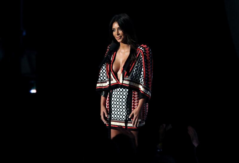 Photos: Kim Kardashian's fashion through the years. INGLEWOOD, CA - AUGUST 24: TV personality Kim Kardashian speaks onstage during the 2014 MTV Video Music Awards at The Forum on August 24, 2014 in Inglewood, California. (Photo by Mark Davis/Getty Images) (Mark Davis/Getty Images)
