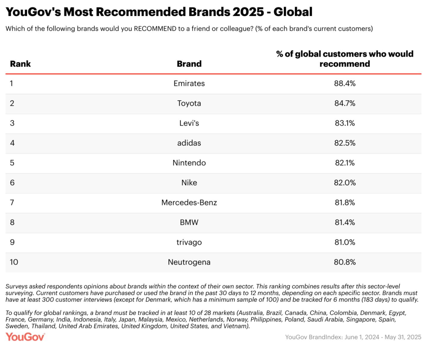 The 2025 recommend rankings, compiled by consumer research firm YouGov, are based on customer surveys measuring how many people say they would recommend a brand they recently interacted with.
