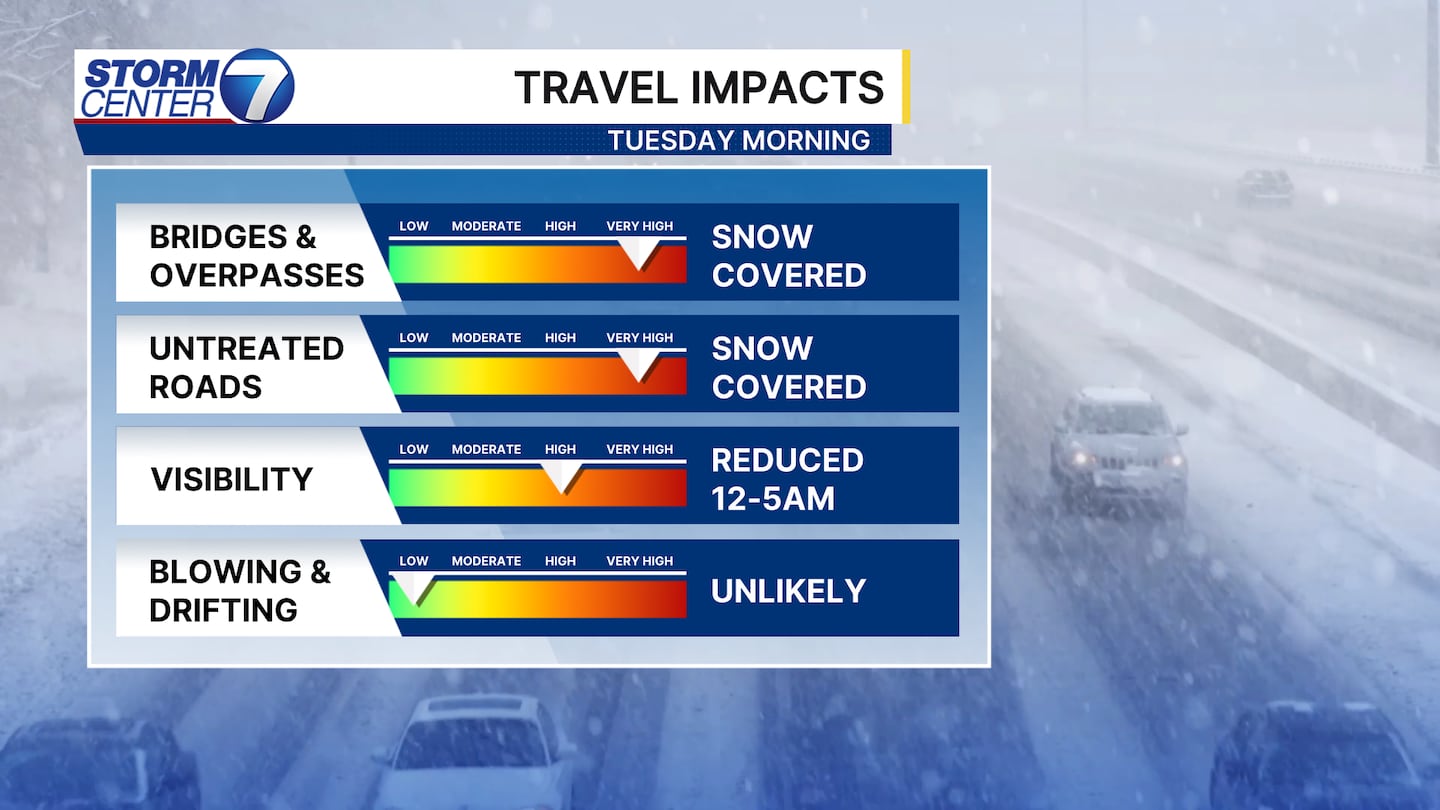 Between midnight and 5AM, snow could be heavy at times, reducing visibility and creating difficult travel conditions. Snow will end Tuesday morning around daybreak.